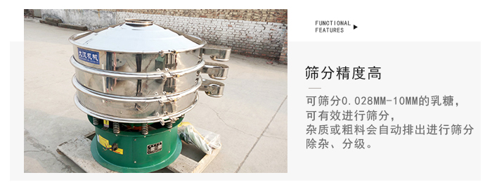 三次元振動篩是由立式振動電機作為激振源,電機上下兩端安裝有扇形的偏心塊,篩分過程中將電機的旋轉運動轉變為水平、垂直、傾斜的三次元運動,再把這個運動傳遞給上端的篩面進行乳糖篩分。將篩分的乳糖沿著篩網篩面進行具有三次元運動改變物料軌跡的篩分運動,再通過篩面上不同尺寸大小的網孔分級過網,以達到不同的除雜分級的目的。