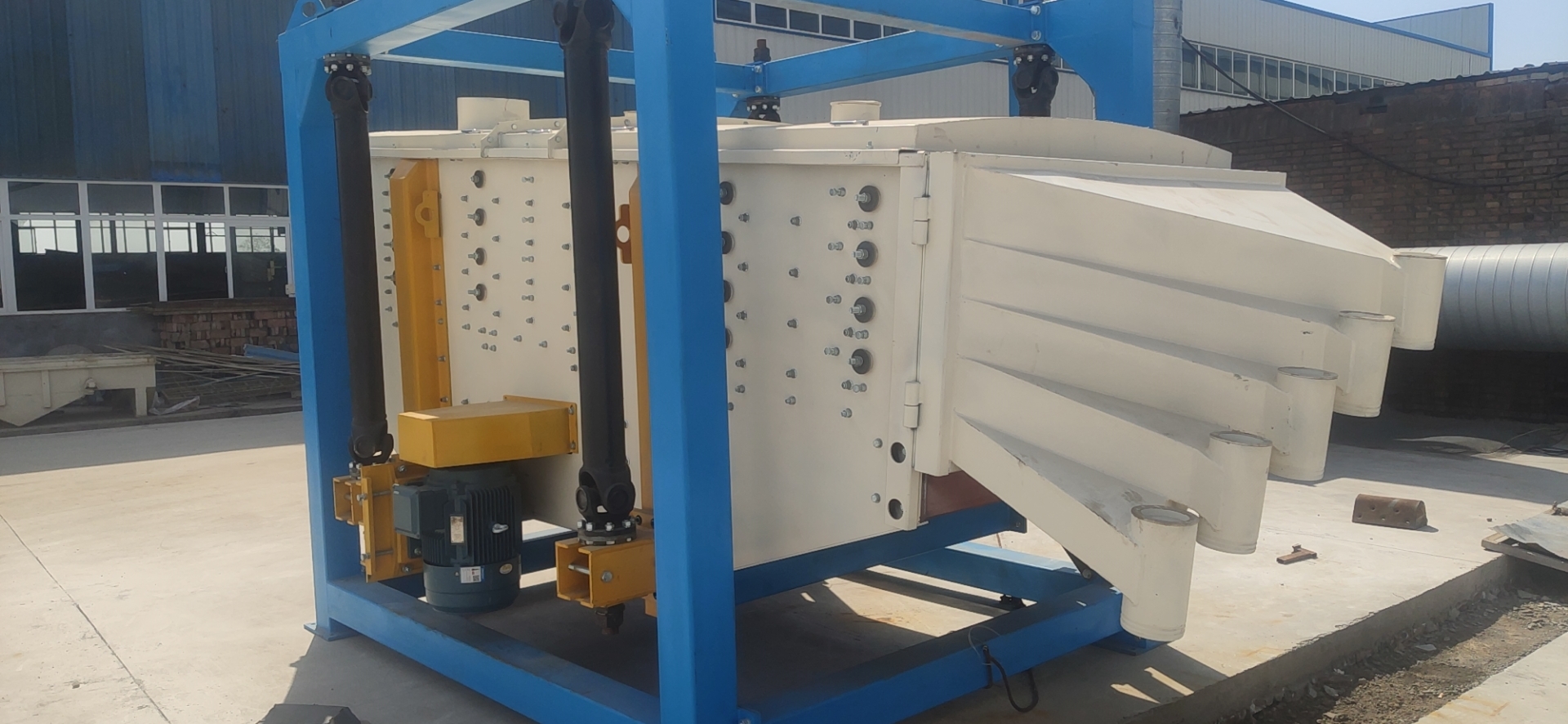 方型搖擺篩利用四根萬向傳動軸把箱體掛在外框架上,通過和變速器、電機的配合,讓箱體進行平面回旋的篩分運動,不僅穩固,而且美觀大方;