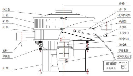 流通式超聲波篩由防塵蓋、進料斗、超聲波振動系統(tǒng)、篩網(wǎng)、出料口、減震底座、電機等組成。超聲波換能器均勻分布于篩網(wǎng)兩側(cè),通過高頻振動快速破除物料粘連,搭配耐磨不銹鋼篩網(wǎng),實現(xiàn)精細(xì)分級。中間層設(shè)導(dǎo)流板引導(dǎo)物料流通,底部減震底座采用橡膠減震墊,減少運行噪音與設(shè)備損耗。